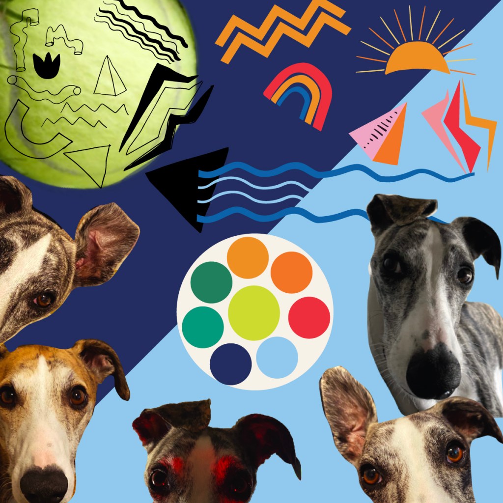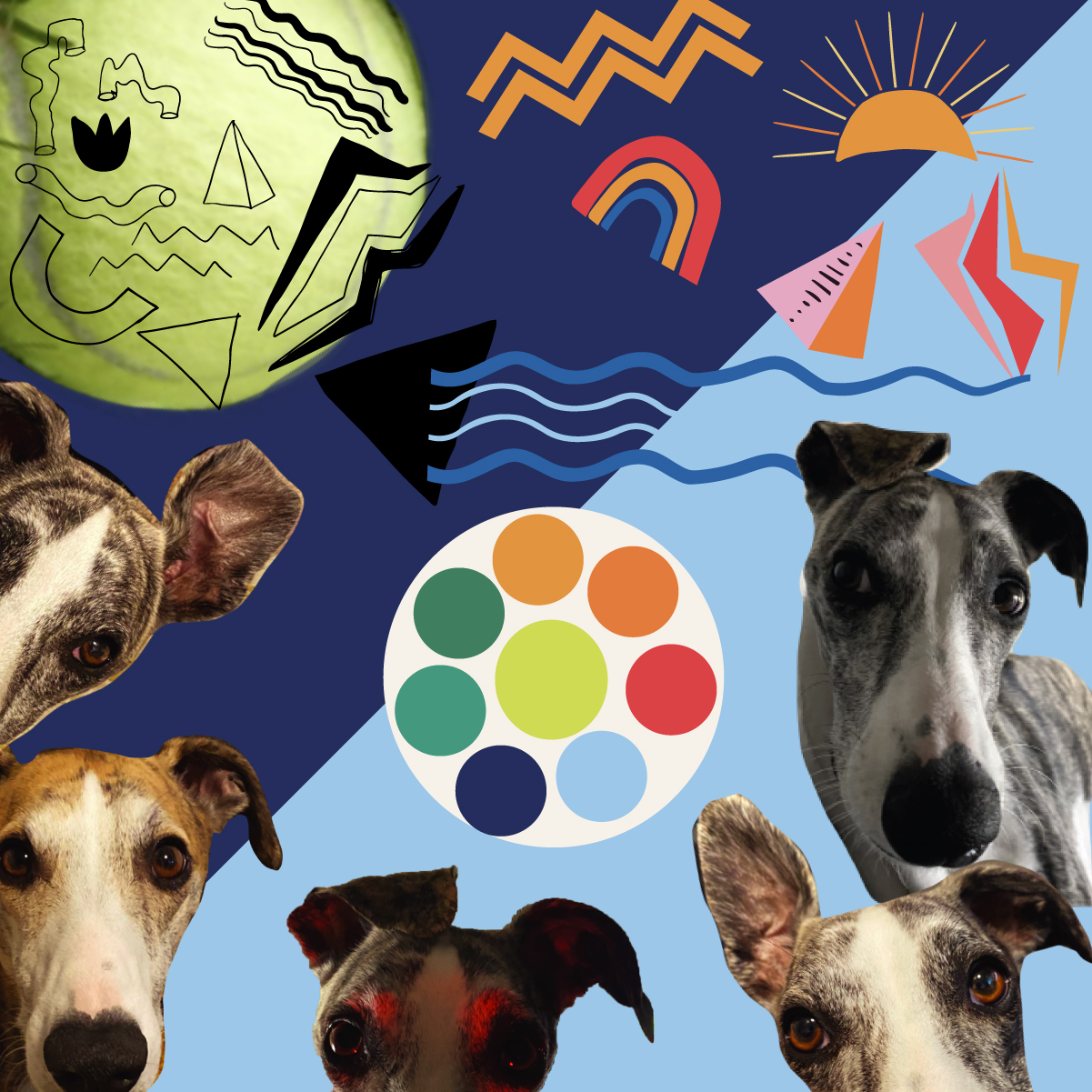 I wanted to capture the silliness of my youngest dog. He’s such a funny boy. I mean those ears – he just can’t get them under control. I was also inspired by Memphis design and pop art colors. (Then there is the older dog, who always looks as though he’s secretly judging me. But I couldn’t leave him out!)
