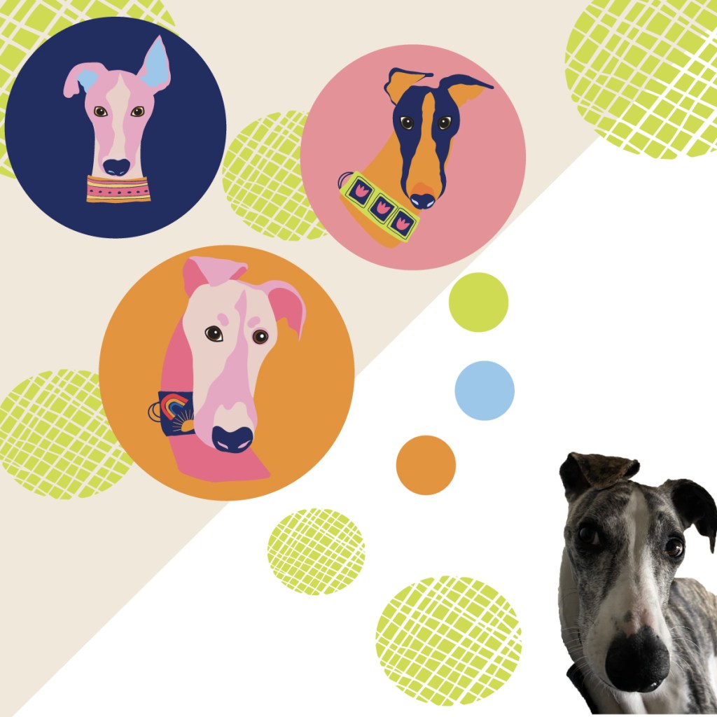 I wanted to capture the silliness of my youngest dog. He’s such a funny boy. I mean those ears – he just can’t get them under control. I was also inspired by Memphis design and pop art colors. (Then there is the older dog, who always looks as though he’s secretly judging me. But I couldn’t leave him out!)